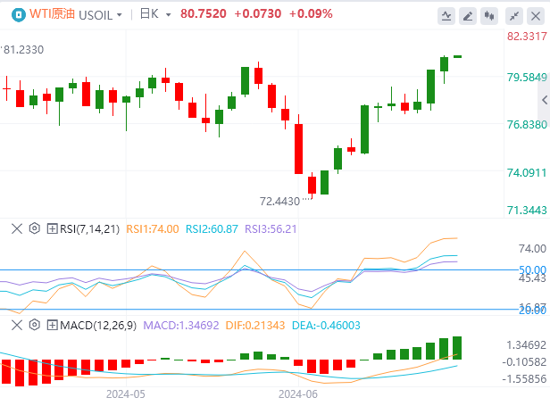 技术面:原油正加速进入看涨区域,因为WTI油价从上一个明显波动低点72.50美元处支撑位上涨。周二,WTI油价突破80.50美元,测试80.70美元,因为桶装油交易商将油价推高,试图夺回先前失去的跌幅。本周WTI油价看涨走势使美国原油突破了200日指数移动均线(EMA),即78.86美元。WTI油价也突破了自2024年最高价87.00美元附近以来的下降趋势线,如果WTI油价上涨受挫,可能会打压WTI油价跌回76.00美元区域。