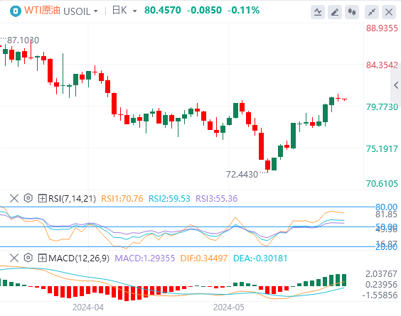 技术面:WTI美国原油暂时停止了从上一个主要波段低点至72.45美元的技术性反弹。过去11个连续交易日中,除了4个交易日外,WTI油价均收盘上涨,并成功突破处在78.84美元的200日指数移动均线(EMA)。WTI油价看涨势头的减弱可能会使美国原油价格重回200天指数移动均线下方,并使WTI油价再度走低,从而打压WTI油价跌破2024年最高水平87.00美元附近的下降趋势线下方。