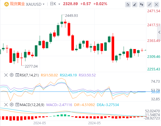 周三亚盘,黄金交投于2328.89附近。与4月份相比,美国5月份的零售销售有所改善,但被下调,暗示经济正在放缓。这一数据,加上上周的消费者通胀报告,增加了9月降息的可能性。其他数据显示,5月份工业生产有所改善,随后在4月份下调。CMEFedWatch工具显示,9月降息25个基点的几率为67%,高于一天前的61%。与此同时,2024年12月的联邦基金期货合约意味着美联储将在年底前降息36个基点。