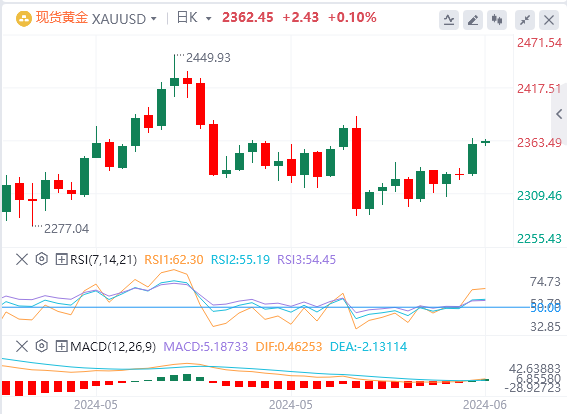 6月21日,北京时间周五亚市早盘,美元指数徘徊在105.60附近。周四,美元指数大幅上涨,最终收涨0.42%,报105.59。10年期美债收益率先涨后跌,最终收报4.264%。对美联储政策利率最敏感的2年期美债收益率最终收报4.750%。由于一系列普遍疲软的经济数据或加大了美联储在晚些时候降息的可能性。现货黄金日内涨超1%,并一度站上2360美元关口,创近两周新高,最终收涨1.36%,报2359.97美元/盎司。现货白银日内大涨3%,并重回30大关上方,最终收涨3.26%,报30.71美元/盎司。两油延续涨势,并逼近逾一个月高点。WTI原油站上81美元,最终收涨0.7%,报81.10美元/桶;布伦特原油收涨0.27%,报84.85美元/桶。