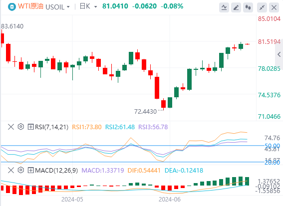 技术面:WTI原油周四延续看涨势头,小幅上涨至81.50美元,因为盘中买盘加速突破从上一个主要波动低点至72.50美元的上升趋势线。美国原油进一步攀升至200日指数移动平均线(EMA)上方,至78.85美元。