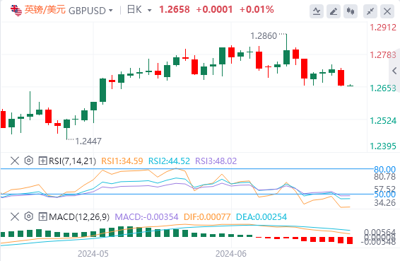 英镑:截止发稿,英镑/美元徘徊于1.2658附近。英镑/美元周四下跌,收报1.2657,跌幅0.50%。在英国央行以7比2的投票结果将利率维持在5.25%后,英镑交易员现在将关注周五即将公布的经济数据。计划发布的数据包括英国零售销售和英国和美国的最新标准普尔全球采购经理人指数数据。预计英国5月零售销售环比将反弹至1.5%,而前值为-2.3%。此外,预计英国采购经理人指数将略有改善。制造业采购经理人指数预计将从51.2上升至51.3,服务业预计将从52.9上升至53.0。技术面上,如果英镑/美元跌破1.2670-1.2700的支撑位,它将走向下一个支撑位1.2550-1.2575。