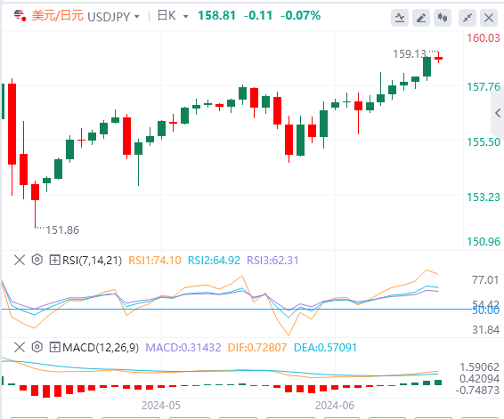 货币市场方面,由于日本央行在7月会议前暂未减少债券购买刺激措施,日元持续走弱至158.91,接近4月末的水平,当时日本当局介入市场以遏制货币的快速贬值。