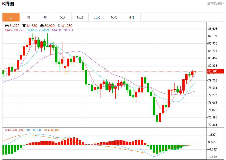 原油市场:截止北京时间20:21,美油下跌,现报81.260,跌幅0.02%。纽市盘前,原油价格下跌至81.50美元水平,并跌破该水平,这促使人们在即将到来的交易中保持谨慎,因为价格需要在该水平以上盘整,以保持今天的看涨趋势,目标是82.25美元,其次是83.90美元水平,作为下一个正站。