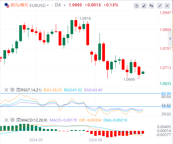 欧元/美元周三连续第二天下跌。周四早盘,该货币对小幅反弹,但仍略低于1.0700。