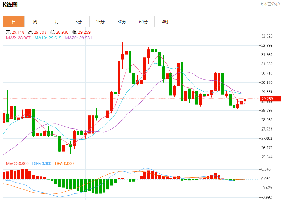 现货白银:截止北京时间20:26,现货白银上涨,现报29.266,涨幅0.52%。纽市盘前,银价再次接近29.30美元水平显示出一些看涨倾向,EMA50遇到这一阻力以增加更多力量,等待恢复负面交易以实现我们第一个等待的目标28.55美元,注意突破29.30美元将导致价格实现额外收益,达到30.06美元。