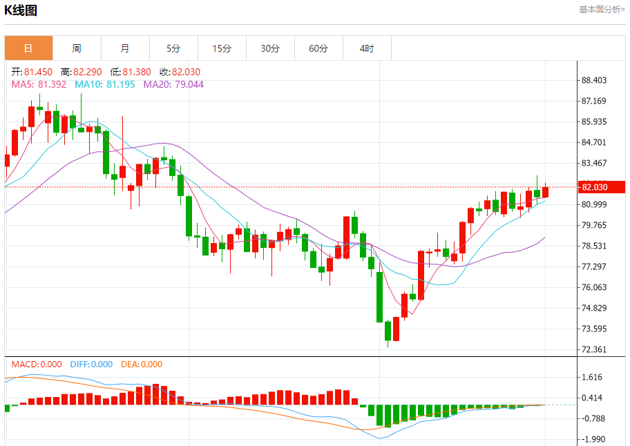 原油市场:截止北京时间20:26,美油上涨,现报82.030,涨幅0.60%。纽市盘前,原油价格在82.00美元附近徘徊,等待获得积极的动力,协助推动价格在未来一段时间继续预期的上涨,因为我们正在等待访问83.90美元作为下一个主要目标。