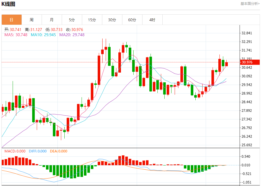现货白银:截止北京时间20:21,现货白银上涨,现报30.977,涨幅0.78%。纽市盘前,白银价格试图突破31.00美元水平,加强了在即将到来的交易中继续看涨趋势的预期,等待访问代表我们下一个目标的31.50美元,注意到随机指标继续提供积极的信号,我们正在等待推动价格确认突破并实现等待的目标。