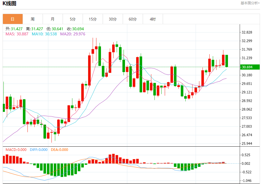 现货白银:截止北京时间20:17,现货白银下跌,现报30.697,跌幅2.35%。纽市盘前,白银价格面临明显的负面压力,以测试关键支撑30.70美元,这促使人们在即将到来的交易中保持谨慎,因为继续下跌并突破这一水平将停止积极的情景,并迫使价格遭受额外的损失,达到30.06美元。