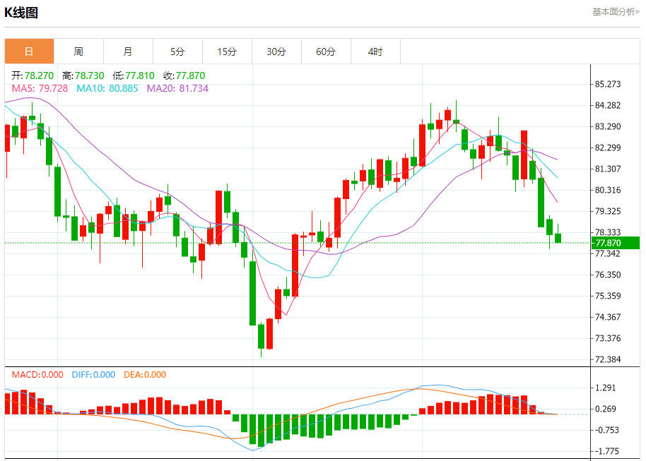 原油市场:截止北京时间20:26,美油下跌,现报77.900,跌幅0.64%。纽市盘前,原油价格试图提供额外的积极交易,只要价格低于80.08美元,我们的看跌观点今天仍然有效,等待超过78.66美元,以加强向我们的下一个主要目标77.24美元反弹的机会,注意EMA50继续支持建议的看跌波。