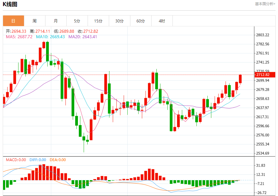 现货黄金:截止北京时间21:26,现货黄金上涨,现报2712.90,涨幅0.60%。纽市盘前,黄金价格显示新的积极交易开始尝试突破2700.00美元水平,加强了今天剩余时间继续看涨趋势的预期,提醒您我们的下一个目标位于2725.00美元。