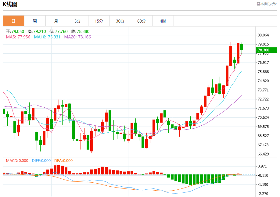 原油市场:截止北京时间21:26,美油下跌,现报78.350,跌幅0.46%。纽市盘前,受RSI负面影响,原油价格显示出一些看跌倾向,等待聚集积极势头,帮助推动价格恢复今天的预期看涨趋势,目标是81.80美元作为下一站。