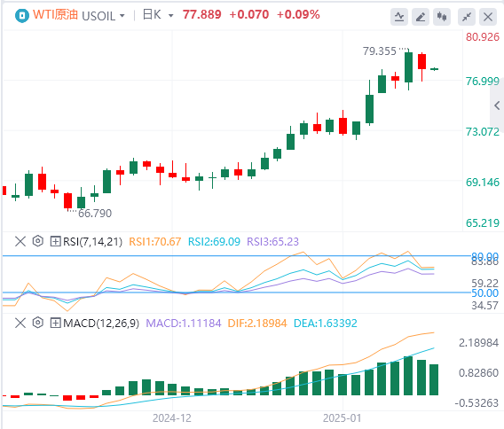 技术面:WTI原油价格在72.00美元区域附近获得支撑。形成一个底部后,价格开始在75.00美元上方开启新一轮上涨。技术日图显示,价格上涨步伐加快,上破了76.80美元阻力位、100简单移动平均线以及200简单移动平均线。上行方面,价格在79.20美元附近面临阻力。主要阻力目前在80.00美元区域附近,若上破该区域,价格可能会加速上涨。在上述情况下,价格甚至可能触及82.50美元阻力位。若再有更多涨幅,短期内可能考验85.00美元阻力区域。下行方面,首个主要支撑位在76.85美元附近。若日收盘价低于76.85美元,可能引发更大幅度的下跌。下一个主要支撑位是75.35美元以及趋势线位置。若进一步下跌,未来几天油价可能跌至72.00美元。