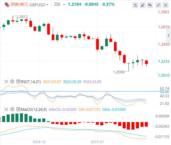 英镑/美元在英国零售销售意外下降0.3%后加速下跌至1.2150,预期为增长0.4%。年度零售销售数据也未能达到预期。疲软的英国通胀和零售销售数据加剧了市场对英国央行(BoE)今年大幅降息的预期。