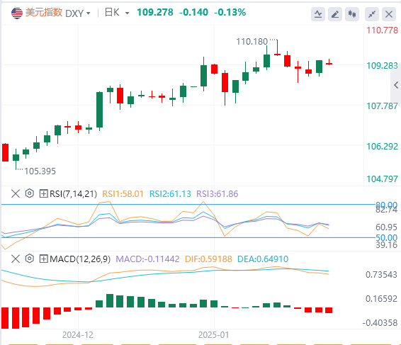 美元指数:截止发稿,美元指数徘徊在109.27附近。,投资者现在正等待特朗普周一的就职演说,以更好地了解他的政策行动,并预计会出现波动。CMEFedWatch工具显示,在即将到来的政策会议上,利率将保持不变的可能性约为97%,因为央行正在等待解读新数据和不断变化的政治因素。技术面上,由于美元指数徘徊在108.30–108.50的支撑位和109.40–109.60的阻力位之间,技术面保持不变。