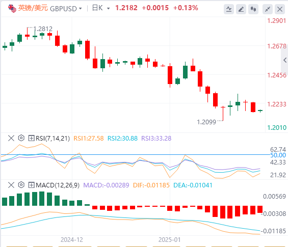 英镑:截止发稿,英镑/美元徘徊于1.2182附近。英镑/美元上周四下跌,收报1.2167,跌幅0.59%。衡量美元兑六种主要货币价值的美元指数(DXY)大幅上涨至109.30上方。尽管投资者消化了美联储鸽派押注的小幅加速,但美元总体上仍然坚挺,而12月核心消费者价格指数(CPI)数据的增长低于预期则提振了这一押注。展望未来,投资者将关注当选总统唐纳德·特朗普在周一宣誓就职仪式后宣布的经济政策。技术面上,成功测试支撑位1.2200–1.2215将为测试下一个支撑位开辟道路,该支撑位位于1.2080–1.2100区间。
