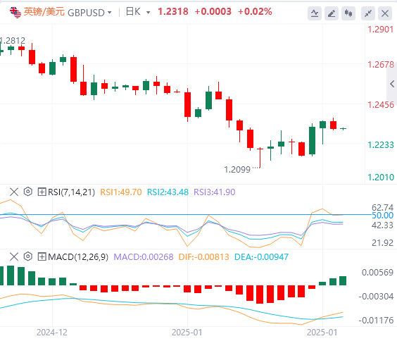 英镑:截止发稿,英镑/美元徘徊于1.2318附近。英镑/美元周三下跌,收报1.2315,跌幅0.32%。在关键数据发布之间的周中缓慢间隙中,市场正在下跌,采购经理人指数(PMI)数据是本周隧道尽头的曙光。由于周四定为低端数据发布日,英镑交易员将转向关注周五大西洋两岸公布的标准普尔全球采购经理人指数(S&PGlobalPMI)数据。预计本周英国和美国1月份的PMI商业活动调查结果将喜忧参半,预计服务业成分将下降,制造业将略有复苏。技术面上,如果英镑/美元回落于1.2300水平下方,它将走向最近的支撑位,即1.2200–1.2215区间。