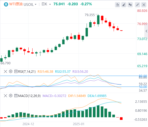 周四亚盘,原油交投75.04附近。WTI价格延续跌势至一周新低,交易员评估美国总统唐纳德·特朗普提议的关税可能如何影响全球能源需求和经济。特朗普周一表示,他正在考虑对加拿大和墨西哥征收25%的关税,同时讨论对2月1日从中国进口的商品征收10%的关税。关税可能会减缓经济增长并拖累黑金价格走低。