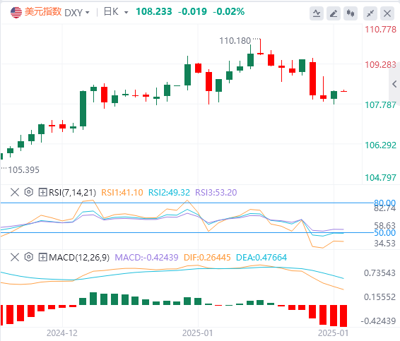 1月23日,北京时间周四亚市早盘,美元指数徘徊在108.23附近。周三,因市场仍在等待特朗普关税政策的相关细节,美元指数徘徊在108关口附近,其盘中一度失守这一关口,而后在美盘前收复全部失地并转涨,最终收涨0.26%,报108.25。美债收益率小幅反弹,基准的10年期美债收益率收报4.616%;对货币政策更敏感的两年期美债收益率收报4.302%。现货黄金延续涨势,并一度冲上2760美元关口上方,创近三个月以来新高,最终收涨0.43%,报2756.01美元/盎司。现货白银则在美盘前回吐日内全部涨幅,最终收跌0.07%,报30.81美元/盎司。受累于特朗普关税的不确定性,两油回落至一周新低。WTI原油盘中一度涨至76.25美元的日内高点,随后迅速回落,跌至75美元附近,最终收跌0.71%,报75.24美元/桶;布伦特原油收跌0.52%,报78.23美元/桶。