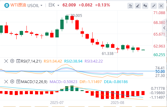 技术面:从技术面来看,WTI原油价格承压,在62.00美元关键水平附近徘徊,且交易价格低于21日平均线(64.76美元)和50日平均线(66.31美元)。看空格局保持完整,若价格跌破该支撑位,可能触发进一步下跌至60.00美元,下一个下行目标为5月8日触及的低点(约57.47美元)。反之,原油价格的即时阻力位在63.69美元(上周高点),随后是64.00-65.00美元区间——该区间受下行移动平均线进一步强化阻力作用。