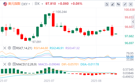 8月25日,北京时间周一亚市早盘,美元指数徘徊在97.91附近。上周五,由于鲍威尔在杰克逊霍尔会议上的讲话提振了市场对9月降息的预期,美元指数盘中跳水,最终收涨0.4934%,报97.7,创8月初以来最大单日跌幅,抹去周内全部涨幅。美债收益率普跌,基准的10年期美债收益率收报4.264%,2年期美债收益率收报3.709%。现货黄金在鲍威尔讲话后直线拉升,盘中最高触及3378.8美元/盎司,最终收涨1%,收报3372.11美元/盎司;现货白银跟随黄金走高,最终收涨1.72%,报38.85美元/盎司。鉴于围绕俄乌潜在的和平协议仍存在不确定性,国际原油持稳,上周为三周以来首次上涨。WTI原油维持在63美元上方,最终收涨0.36%,报63.65美元/桶;布伦特原油最终收涨0.25%,报67.32美元/桶。