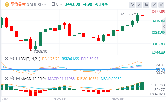 周一亚盘,黄金徘徊在3443.08附近。黄金保持了其看涨势头,攀升至自7月底以来的最高水平,超过3400美元。即将发布的美国宏观经济数据,如商业活动和就业数据,可能会影响市场对美联储(Fed)政策前景的定价,并推动XAU/USD的短期走势。