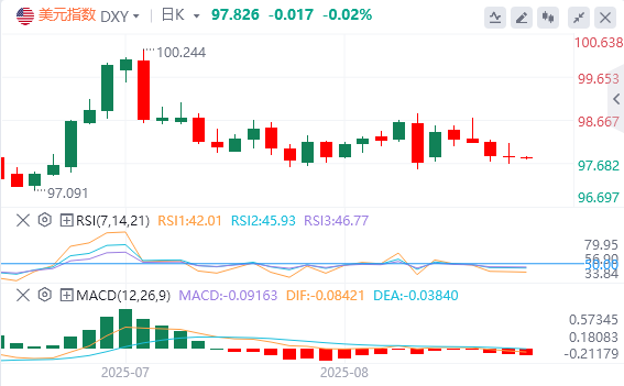 美元指数:截止发稿,美元指数徘徊在97.82美元。美元在经历了连续三周的损失后,本周有所回升。然而,它仍然徘徊在年度区间的底部,美元指数保持在98以下。技术面上,美元指数正试图收于97.75水平下方。如果这次尝试成功,它将走向最近的支撑位,即位于97.10–97.30区间。