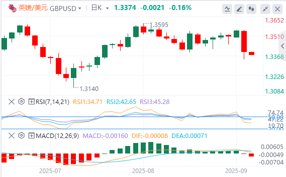 英镑:截止发稿,英镑/美元徘徊在1.3374附近。英镑/美元周二大幅下跌,跌幅超过1.15%,近一个月来首次跌破1.3800关口。进入9月交易月,大盘投资者情绪恶化,流入美元的避险资金激增。技术面上,如果英镑/美元保持在阻力位1.3400–1.3415下方,则将走向最近的支撑位1.3315–1.3330。RSI最近回到温和区域,因此短期内有很大的动力空间。