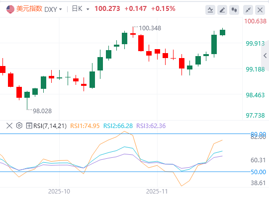 周三,在避险情绪和美联储12月可能按兵不动的预期提振下,美元指数连续第四个交易日走强,站上100关口,创近两周新高,截至目前,美元报价100.27。