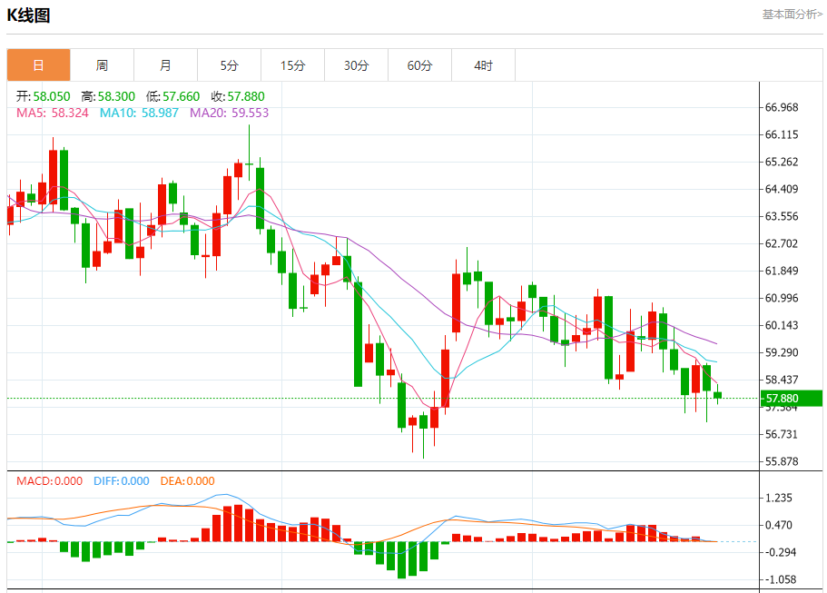原油市场:截止北京时间21:20,美油下跌,现报57.880,跌幅0.10%。纽市盘前,受短期小幅看跌趋势测试的影响,(原油)价格在最后一次盘中交易中下跌,由于交易低于EMA50,其影响加剧。此外,相对强弱指标上出现负面叠加信号,表明价格在早盘交易中上涨动能迅速减弱。