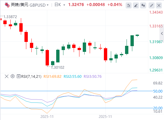 技术面:技术面来看,现货黄金日线图呈现对称三角形整理形态,目前正尝试突破上轨阻力。若突破成功,将进一步巩固牛市趋势,上行空间有望打开,后续目标看向4200美元及4250美元。支撑方面,初步支撑位于4150美元附近;更强支撑区间为4050-4070美元,该区间同时与三角形下轨及21日简单移动平均线(SMA)重合。相对强弱指数(RSI)当前报60,显示多头动能强劲,且尚未进入超买区间,仍有进一步上行空间。