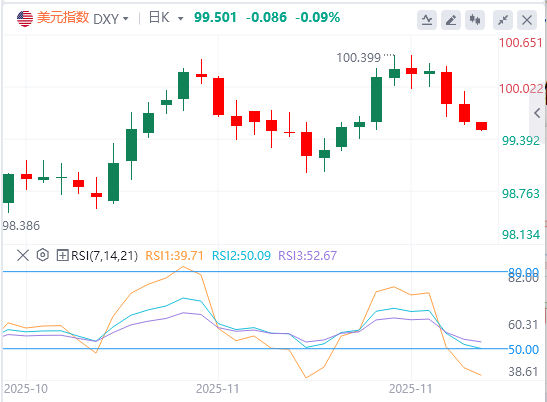 11月27日,北京时间周四亚市早盘,美元指数徘徊在99.50附近。周三,美元指数呈现倒V走势,盘中一度逼近100关口,但随后急转直下,最终收跌0.237%,报99.57;美债收益率涨跌不一,基准的10年期美债收益收报3.997%%,对美联储政策利率敏感的2年期美债收益率收报3.483%。由于市场对美联储在下月会议上降息的预期进一步增强,现货黄金走高,再创一周多新高,最终收涨0.8%,报4163.76美元/盎司;现货白银涨势更加显着,最终收涨3.63%,报53.36美元/盎司。国际原油跟随风险资产走高,较前一交易日触及的一个月低点小幅反弹,市场呈现感恩节假期前成交量稀薄的典型特征。WTI原油震荡走高,最终收涨0.67%,报58.48美元/桶;布伦特原油最终收涨0.71%,报62.41美元/桶。