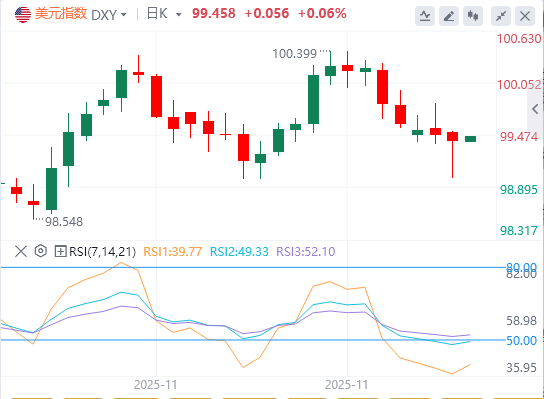 12月2日,北京时间周二亚市早盘,美元指数徘徊在99.45附近。周一,美国11月ISM制造业PMI不及预期,美元指数维持弱势,盘中一度逼近99大关,最终收跌0.07%,报99.41点;基准的10年期美债收益率最终收报4.0920%,对美联储政策利率敏感的2年期美债收益率收报3.5490%。受助于美国降息预期和美元走软,现货黄金升至六周最高水平,最终收涨0.37%,报4233.54美元/盎司;现货白银创纪录新高,一度逼近59美元大关,最终收涨2.88%,报57.96美元/盎司。因为连接哈萨克斯坦油田与俄罗斯黑海沿岸的关键管道在乌克兰袭击后受损,同时交易员评估美国对委内瑞拉的潜在军事行动,国际油价上涨。WTI原油站上59美元上方,最终收涨1.83%,报59.52美元/桶;布伦特原油最终收涨1.67%,报63.35美元/桶。