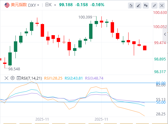 周二,特朗普积极暗示哈塞特为下任美联储主席,美元指数尾盘承压,截至目前,美元报价99.18。