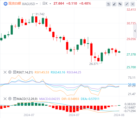 从白银4H周期图来看,价格经过前期大幅下跌行情,空头下跌幅度和力度都已经有所减缓,价格在26.44附近受到月线级别支撑影响后,逐步上行,上行至28.04附近后受压制,短期回落至27.16附近反弹,显示27.16附近支撑较强。叠加CCI指标从超卖区间拐头向上,预示行情随时可能起涨,日内可以等待银价回落至27.16支撑位附近,尝试布局多单。
