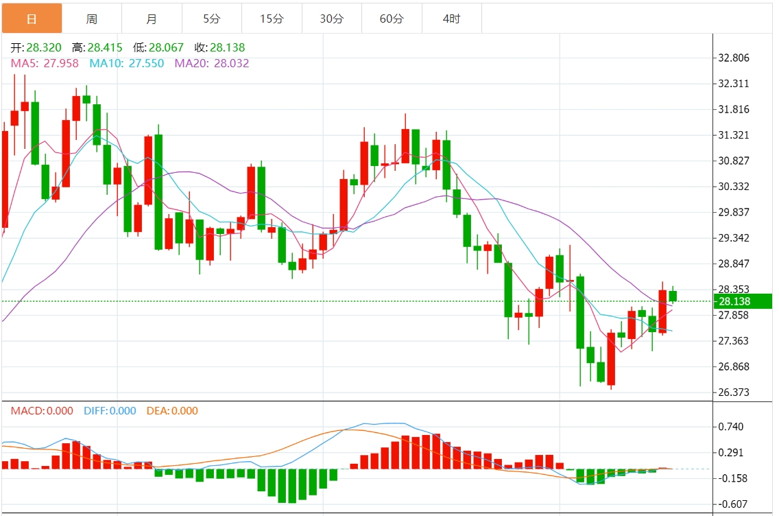 今天的预期交易区间在 27.60 美元的支撑位和 28.55 美元的阻力位之间。