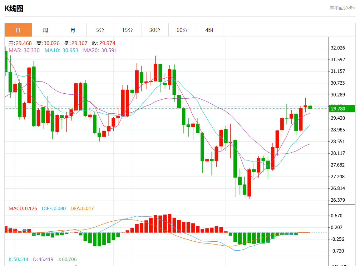 周二欧市盘中,现货白银报29.900,跌幅0.05%。