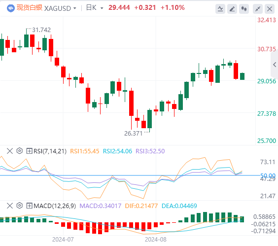 从白银4H周期图来看,价格自低点上行至高点30.18附近后,有所回落,并且下穿均线系统MA20和MA60,显示当前行情上行动力逐渐减弱,同时CCI指标形成顶背离,预示价格或短期有所调整,日内可等待反弹至29.38压力位附近,尝试布局空单。