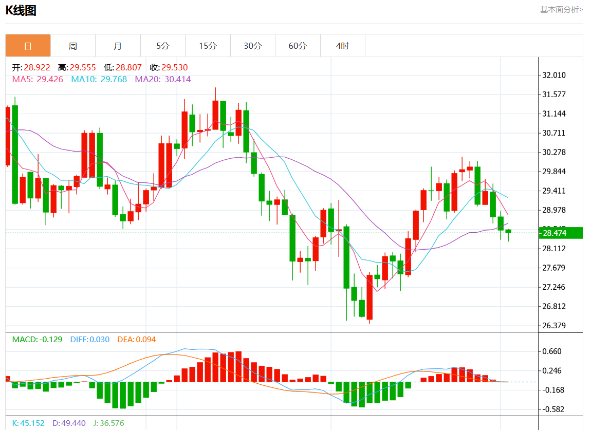 周一欧市盘中,现货白银报28.440,跌幅0.31%。