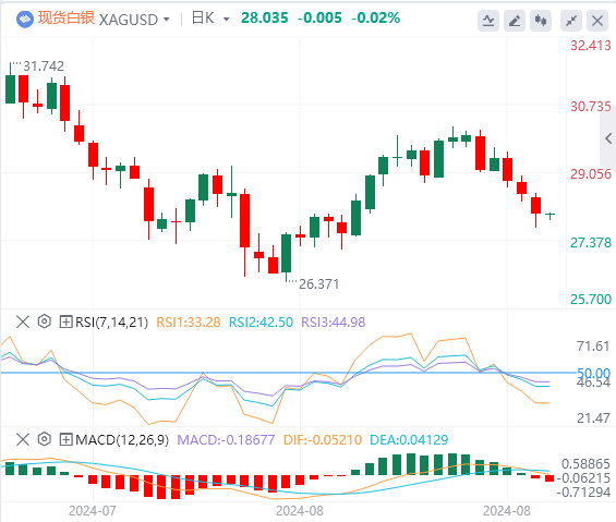 从白银4H周期图来看,白银价格上破前期下行趋势线,形成底部反转后,目前是1浪上行后的2浪调整,调整后,继续上行的概率较大。下方的27.50支撑明显,不破这里,价格将获得支撑。均线系统的MA20和MA60,显示当前行情上行动力逐渐减弱,价格经历大幅上涨后目前在高位有调整需求,日内可等待回落至27.50附近,尝试布局多单。