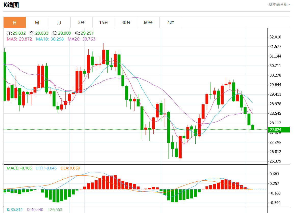 周三欧市盘中,现货白银报27.840,跌幅0.68%。
