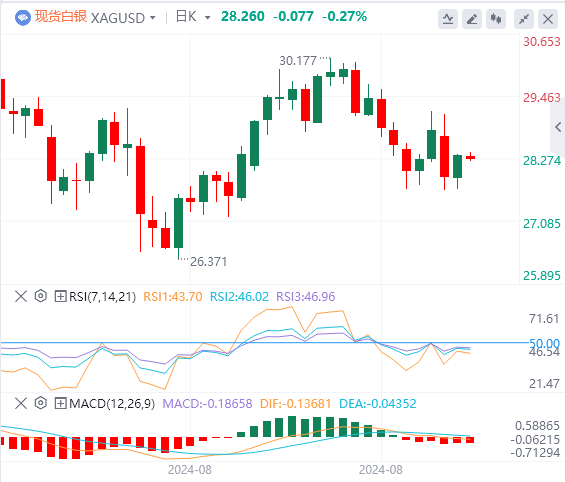 白银处于空头弱势下行浪当中,短线昨日空头再次下探关键支撑位27.80一线,多头强势收阳包阴k线,表明支撑力度有效,多头开启反攻势头。从结构上看白银形成小双底形态信号,表明多头企稳开始反弹。从下方MACD指标来看,快慢线0下金叉信号出现,表明多头开启反弹浪行情。操作上建议逢低布局多单思路为主。