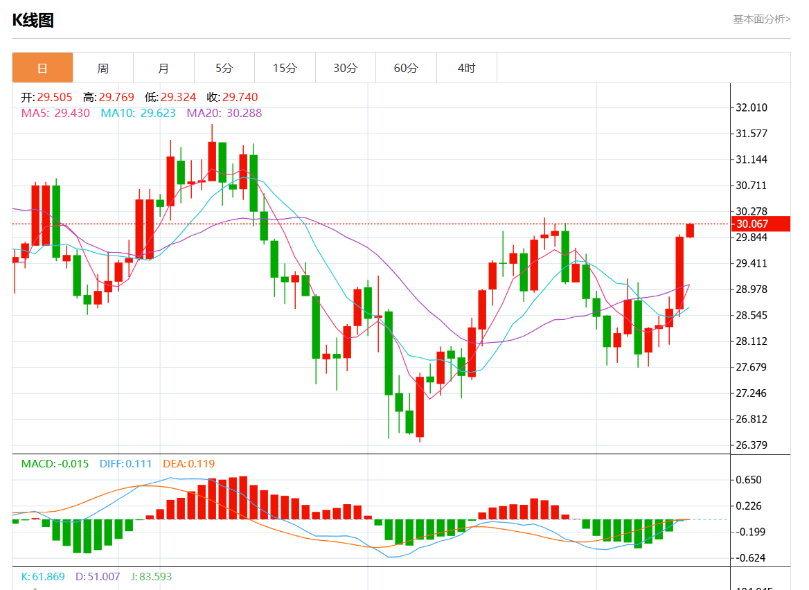 周五欧市盘中,现货白银报30.060,涨幅0.69%。