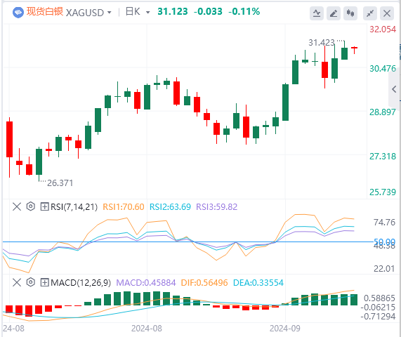 白银价格自低点起涨以来,高低点同步上移,呈现强势的多头行情,均线系统多头排列,对价格有一定支撑作用。均线MA20当前在30.80附近走平后拐头向上,显示多头在经过激烈的多空争夺中胜出,目前占优,CCI指标在下方显示顶背离,预示短期价格或将有所回落,日内可等待价格回落至30.60支撑位附近,尝试布局多单。