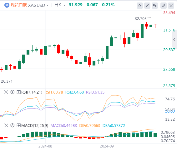 从白银1小时周期图看,白银多头在关键压力位32.50遇阻开始跳水回落,表明多头获利盘出逃不少,多头动能开始减弱,行情陷入了短期高位震荡及下行回落节奏。综合MACD指标看,快慢线高位死叉信号形成,同时高点对应的红色动能柱面积在减小,表明价格有背离信号。策略上短期价格处于震荡及回落节奏,建议逢高在压力位埋伏空单思路为主。