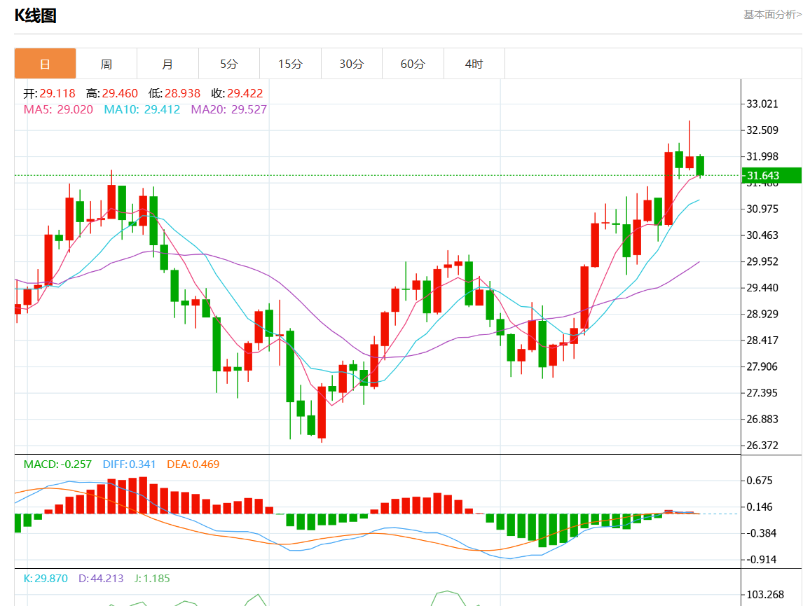 周五欧市盘中,现货白银报31.771,跌幅0.67%。