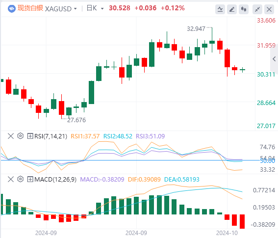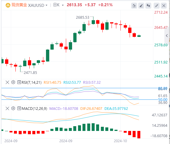 近期金价自2685.0附近受到卖盘打压,价格震荡下跌,空头不断创出新低,隔夜价格再探前低2604.0附近,交易重心维持下移,表明金价处于偏空趋势中。均线系统上,短期60均线下穿长期100均线,且双双拐头向下,表明当前行情处于强势空头走势中。亚市早盘时段,价格位于隔夜收盘价附近震荡,短期不改当前高位回落走势。日内操作上尝试逢高做空,关注压力位2624.0附近,如若在此承压,可考虑布局空单,下行关注2604.0一线的支撑位,若下破,空头将再次测试2589.0一线。