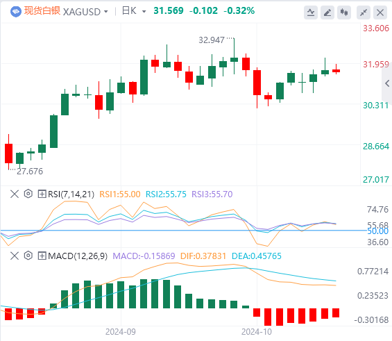 本轮多头自30.10一线开始再次进场,多头不断创出新高,隔夜价格再探32.27一线,整体交易重心震荡上行,表明价格处于偏多走势中。均线系统上,60均线高于 100均线,且双双拐头向上,形成多头排列之势,表明银价处于强势多头中。操作上,坚持顺势而为逢低做多的操作思路,关注支撑位31.55一线,如若在此震荡企稳,可考虑布局多单,上行关注32.27一线,若上破则进一步测试32.96一线的压力位。