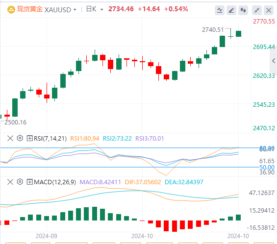 黄金在飙升至纪录高位后稍作喘息,因美国公债收益率和美元走高抵消了美国大选和中东战争的不确定性增加所带来的支撑。现货金收盘微跌0.03%,报每盎司2719.3美元,盘初曾触及纪录新高2740.4美元附近。