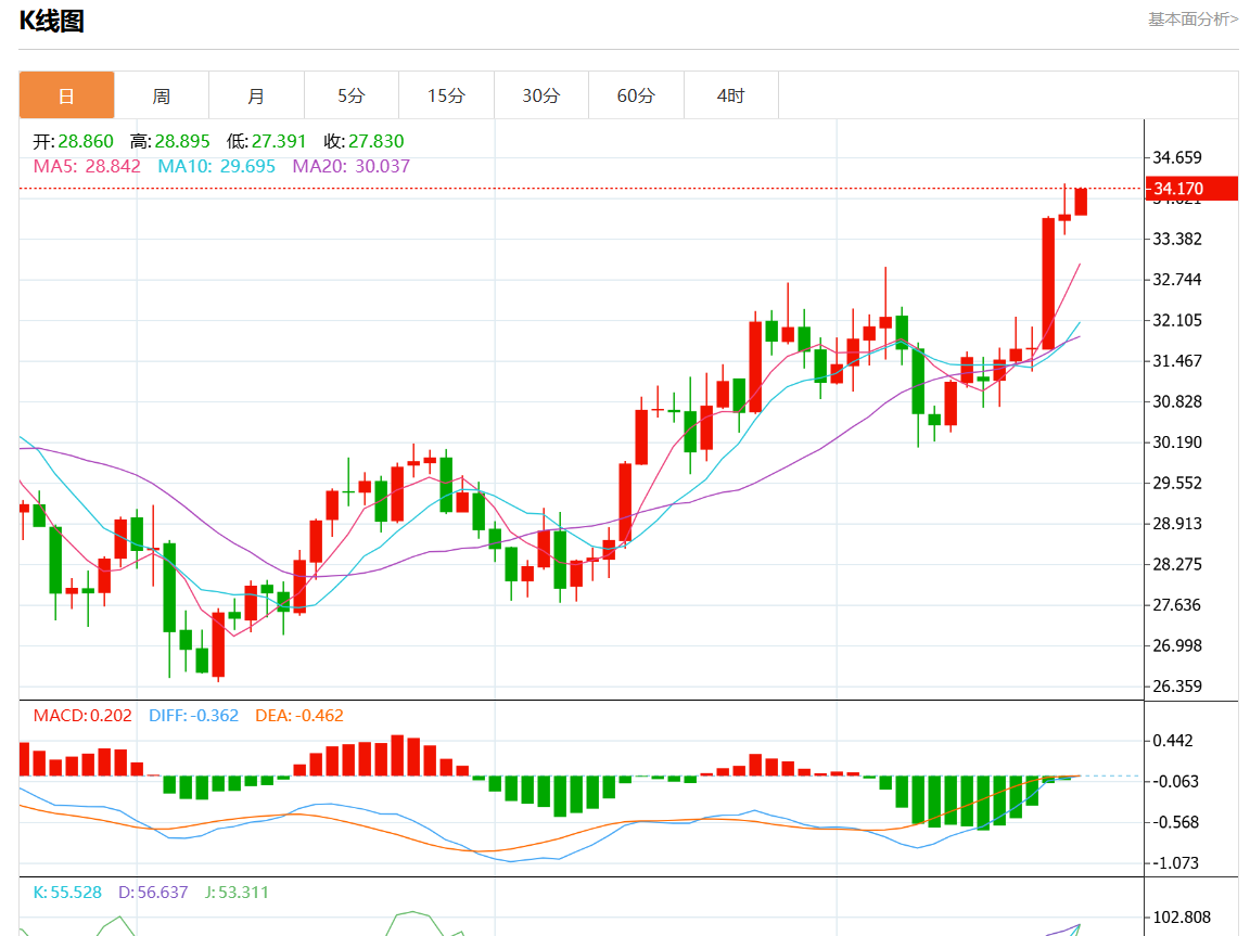 周二欧市盘中,现货白银报34.200,涨幅1.30%。